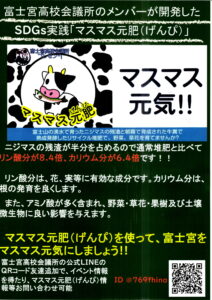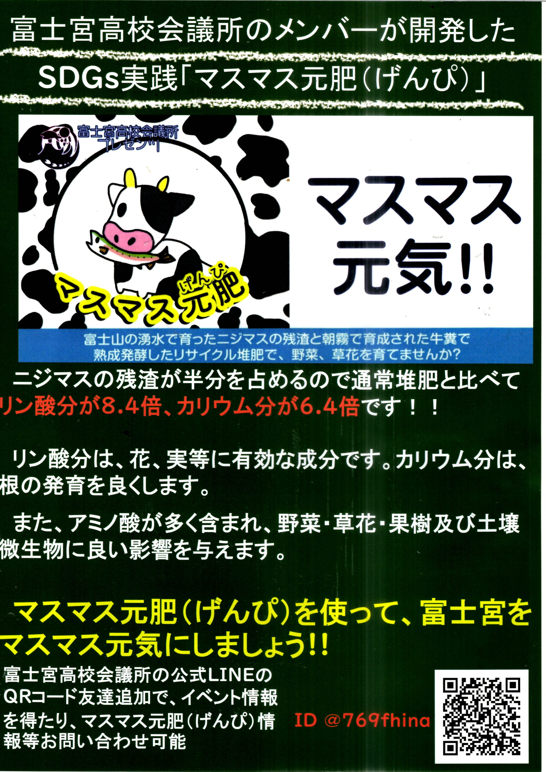静岡県富士宮市は、日本一のニジマスの養殖量を誇っています。富士宮高校会議所は、SDGs実践として、廃棄していたニジマスの残渣(白糸滝養魚場)を朝霧牛の糞尿(朝霧メイプルファーム有限会社)とコラボして作成(富士バイオテック株式会社)した堆肥を「マスマス元肥(ゲンピ)」として開発しました。マスマス元肥(ゲンピ)を活用して、富士宮を持続可能な社会作りを実践してさらにマスマス元気にしたいと思っています。ニジマスの残渣が半分を占めるので、通常堆肥と比べてリン酸分が8.4倍、カリウム分が6.4倍です。リン酸分は、花、実等に有効な成分です。カリウム分は、根の発育を良くします。