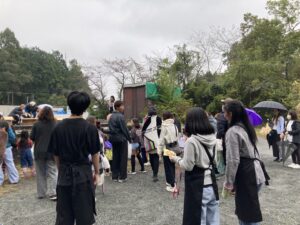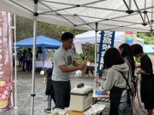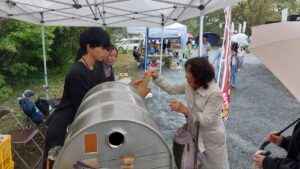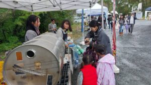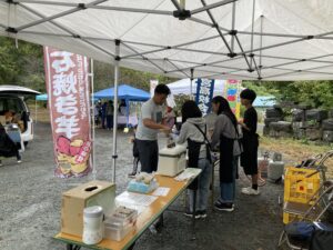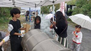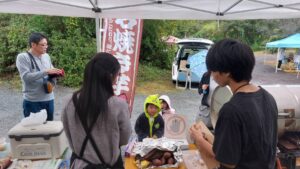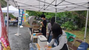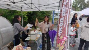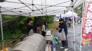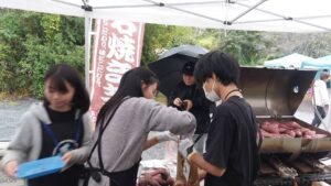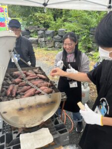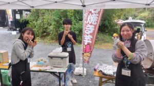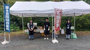 富士宮高校会議所のメンバーは、マスマス元肥で栽培したサツマイモの焼き芋、マスマス元肥で栽培したサツマイモを活用して富士の菓子処藤太郎さんとコラボして作成した「マスマス元気いもプリン、マスマス元肥を販売しました。