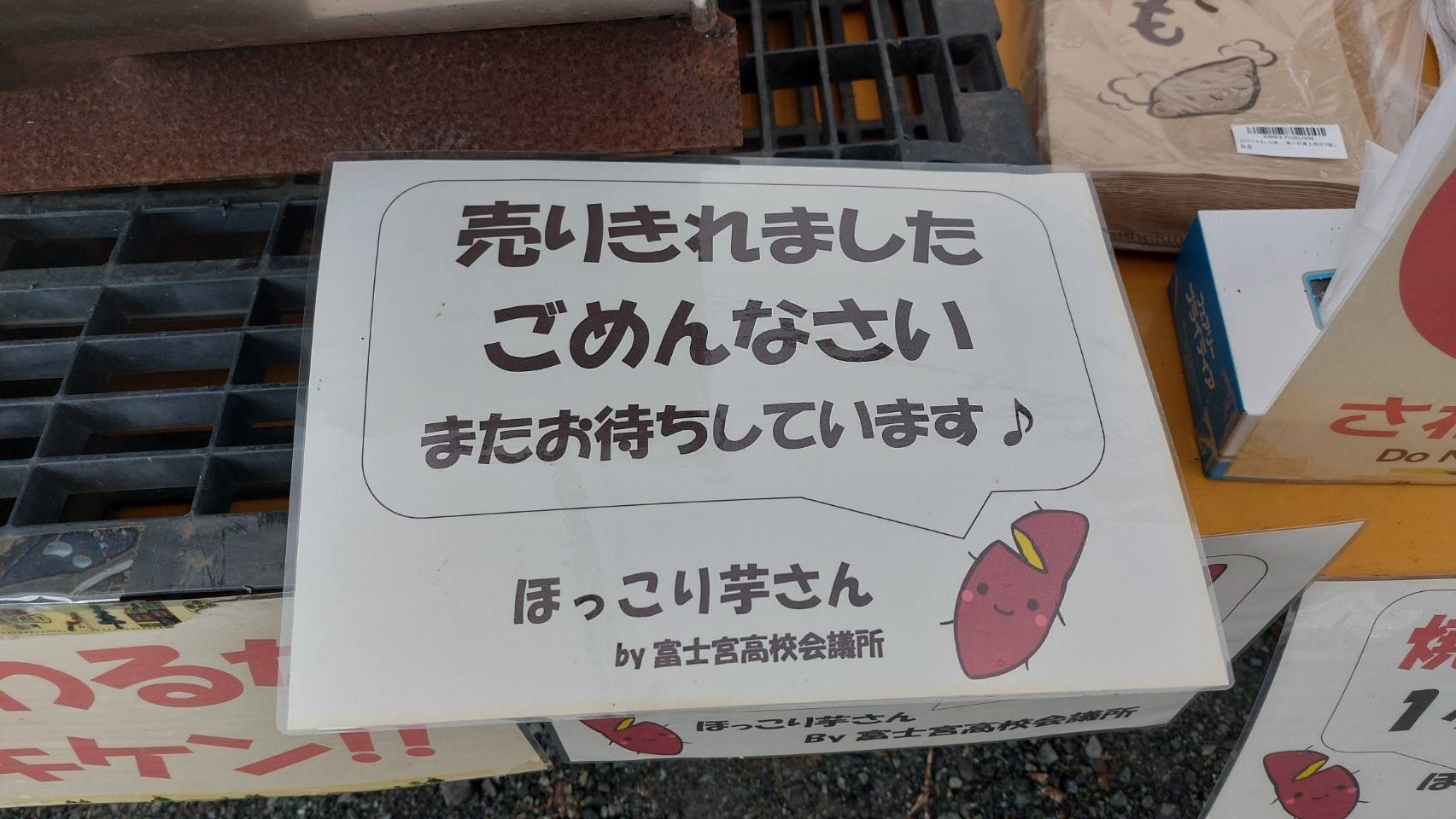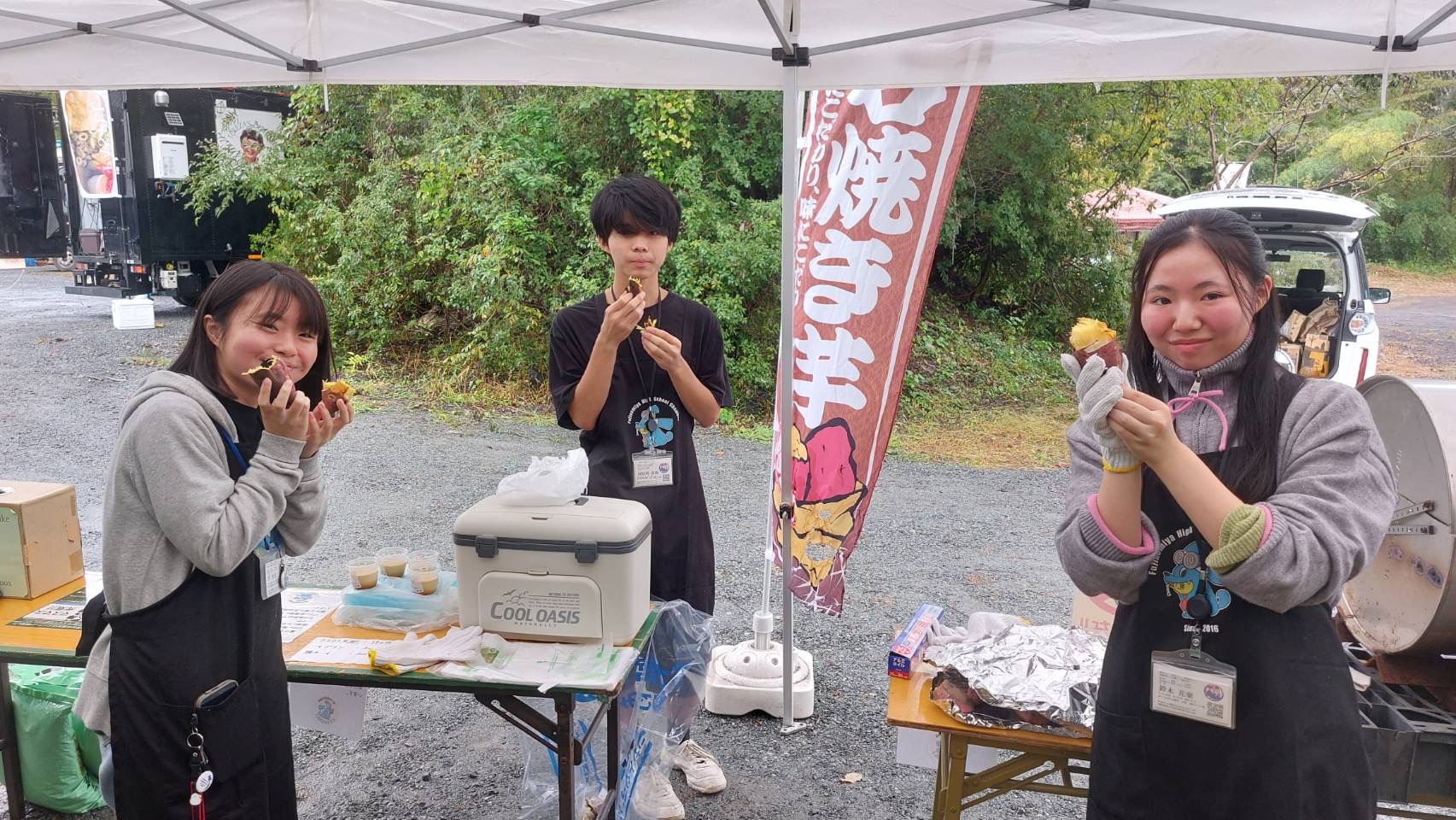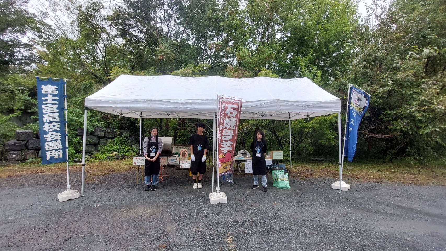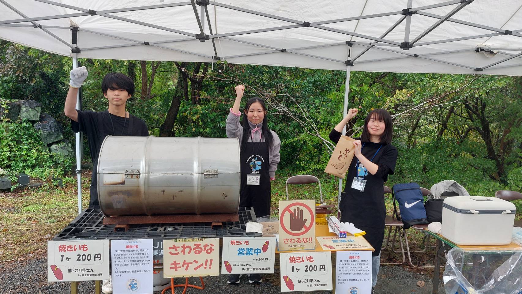 富士宮高校会議所のメンバーは、マスマス元肥で栽培したサツマイモの焼き芋、マスマス元肥で栽培したサツマイモを活用して富士の菓子処藤太郎さんとコラボして作成した「マスマス元気いもプリン、マスマス元肥を販売しました。