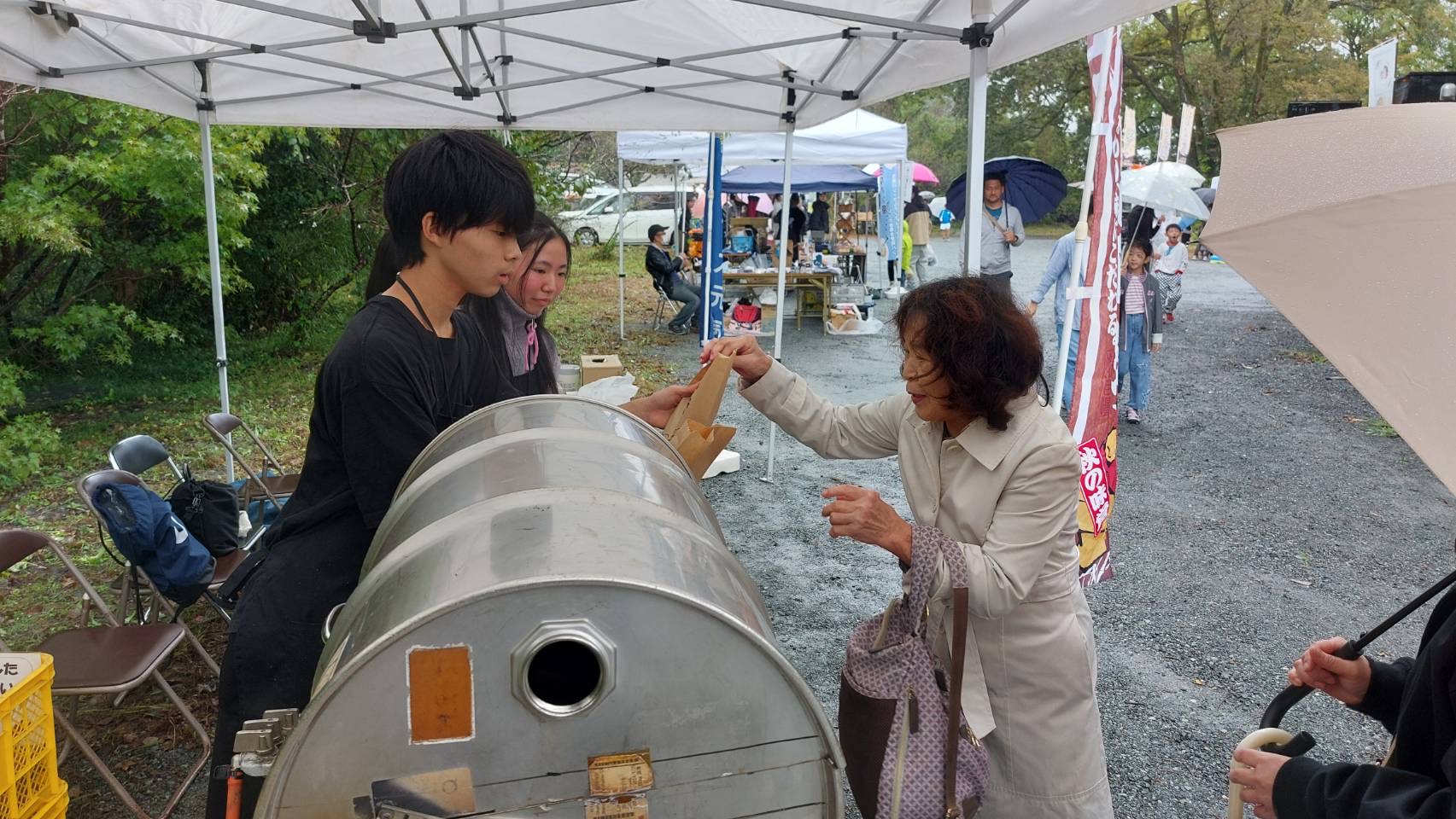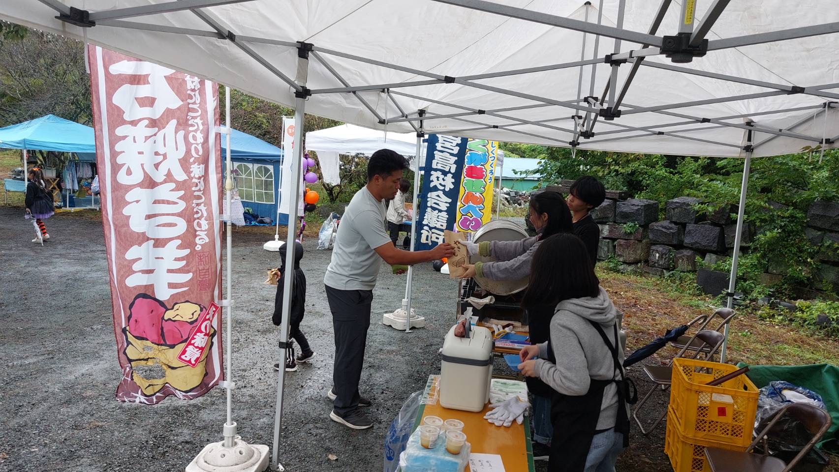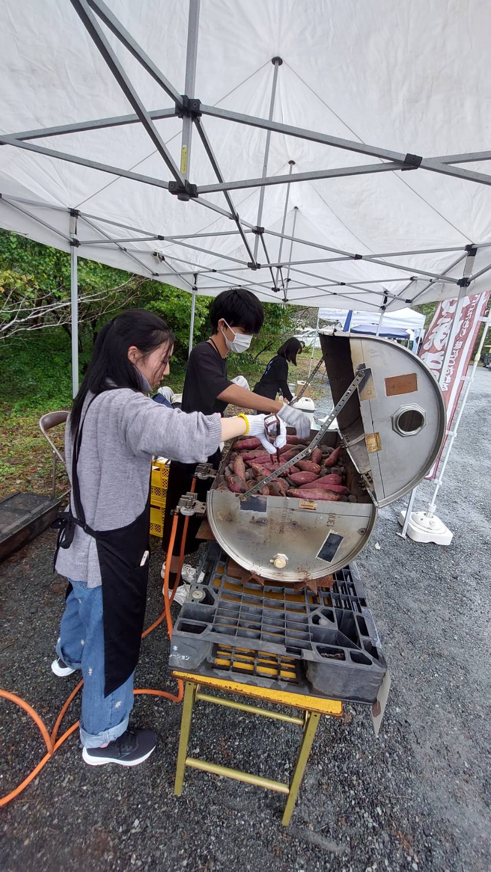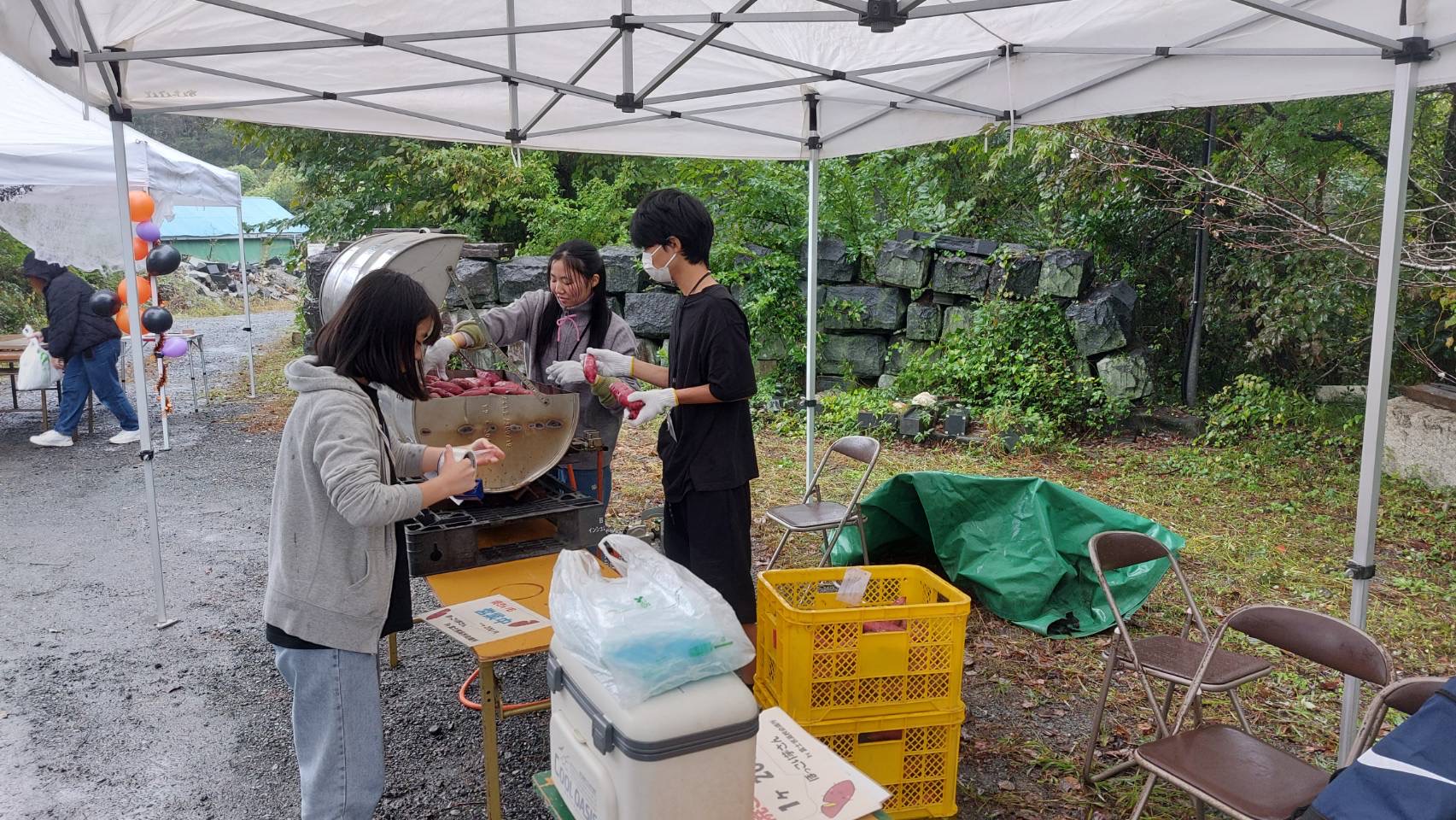 富士宮高校会議所のメンバーは、マスマス元肥で栽培したサツマイモの焼き芋、マスマス元肥で栽培したサツマイモを活用して富士の菓子処藤太郎さんとコラボして作成した「マスマス元気いもプリン、マスマス元肥を販売しました。