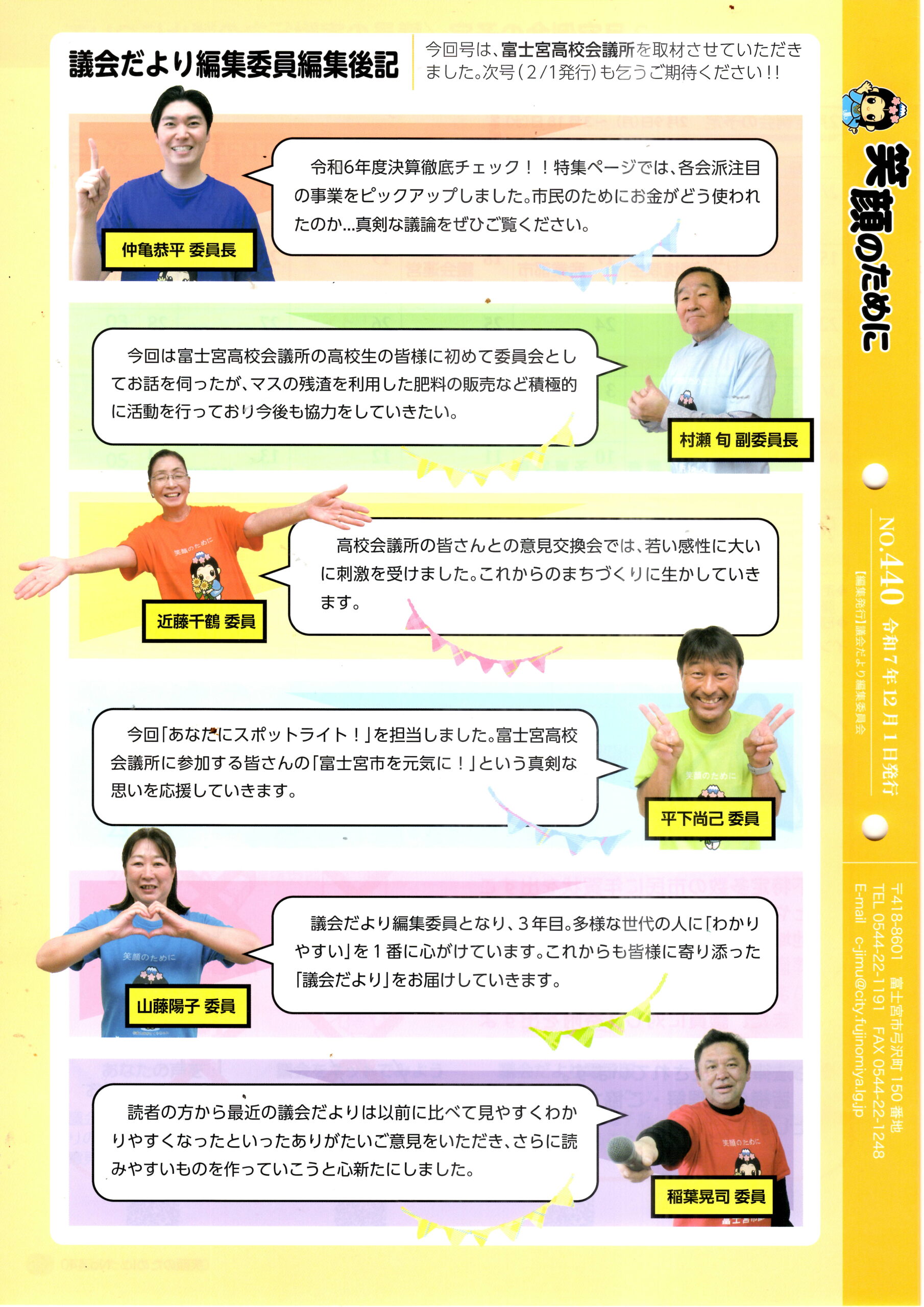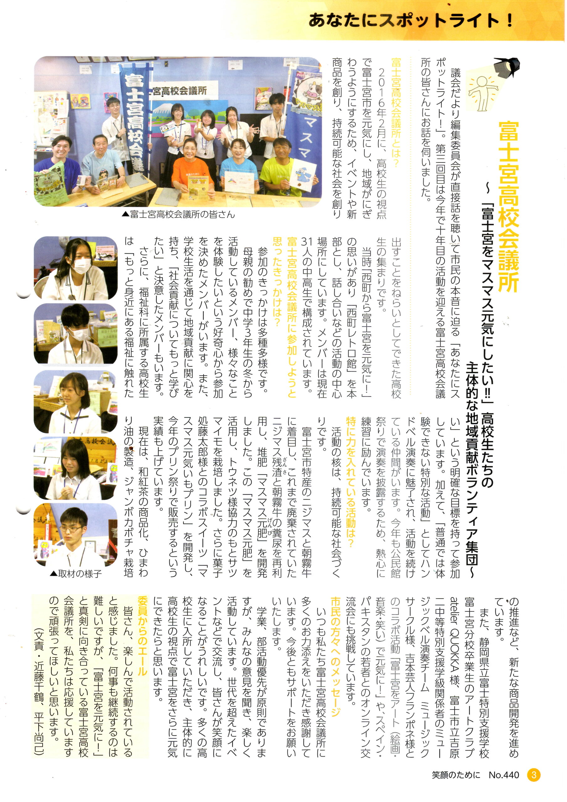 富士宮高校会議所のメンバーは、議会だより 笑顔のために 編集委員の皆さんに取材を受けましたが、このたび12月1日の議会だよりに掲載されました。