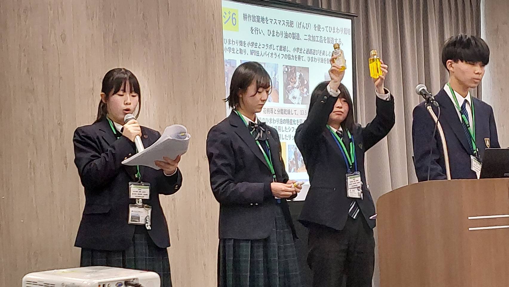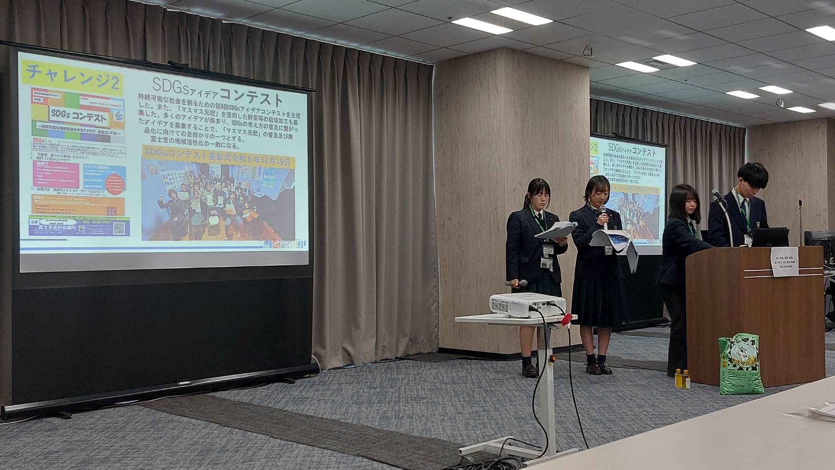 富士宮高校会議所の開発した、SDGs実践「マスマス元肥」というニジマスの残渣と朝霧牛の牛糞から開発した堆肥を活用したサツマイモ、お茶等からスィーツ(マスマス元気いもプリン)、ジェラード等の製造・販売及び栽培したひまわりから、ひまわり油を製造し、シフォンケーキ、化粧品等を起業、お店とコラボして、持続可能な社会をビジネス的視点を入れて、創ろうとした点が評価されました。