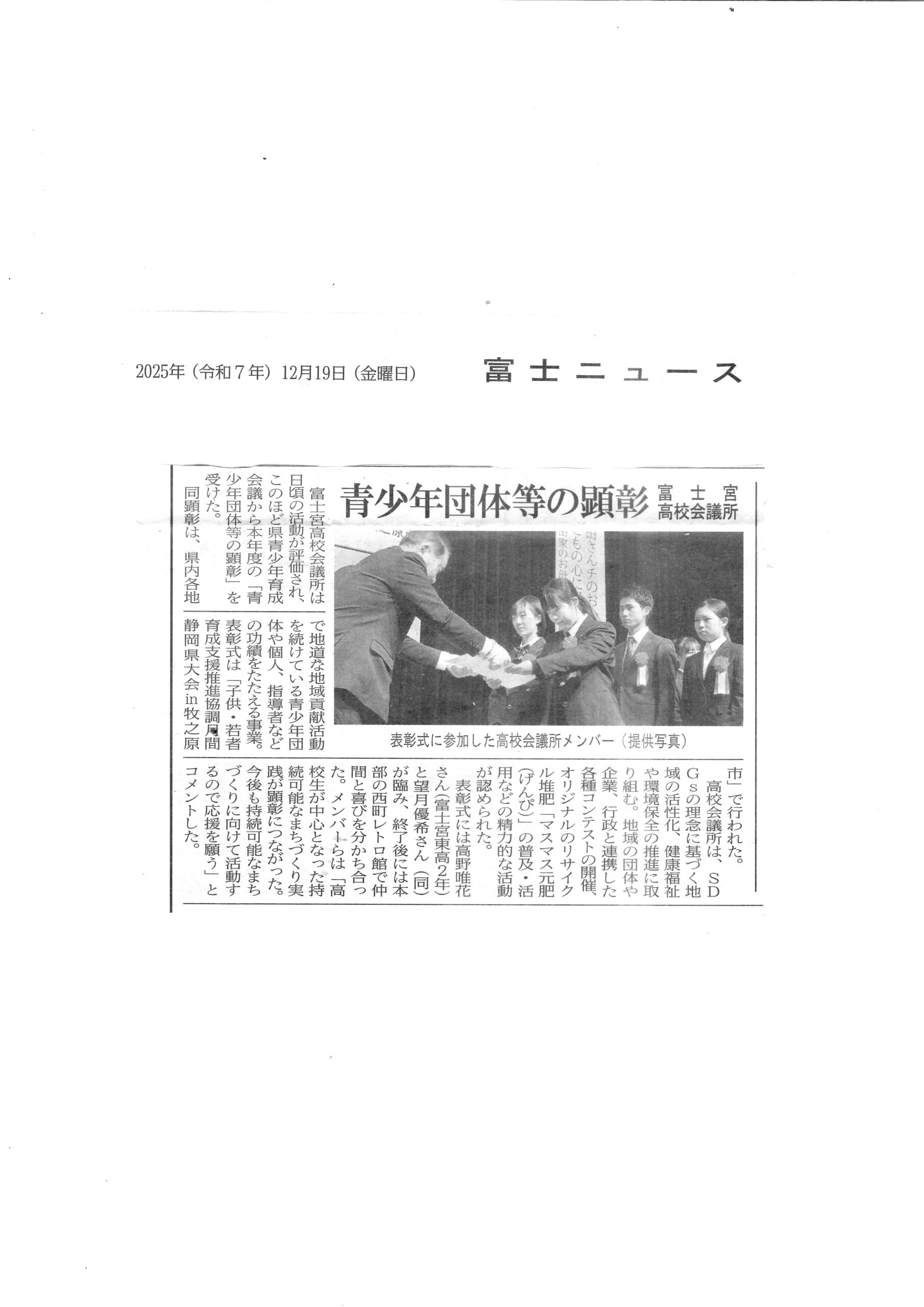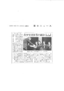 富士宮高校会議所のメンバーは、日頃の活動を評価され、令和7年度青少年団体等の顕彰の表彰を受けた様子が、富士ニュースに掲載されました。