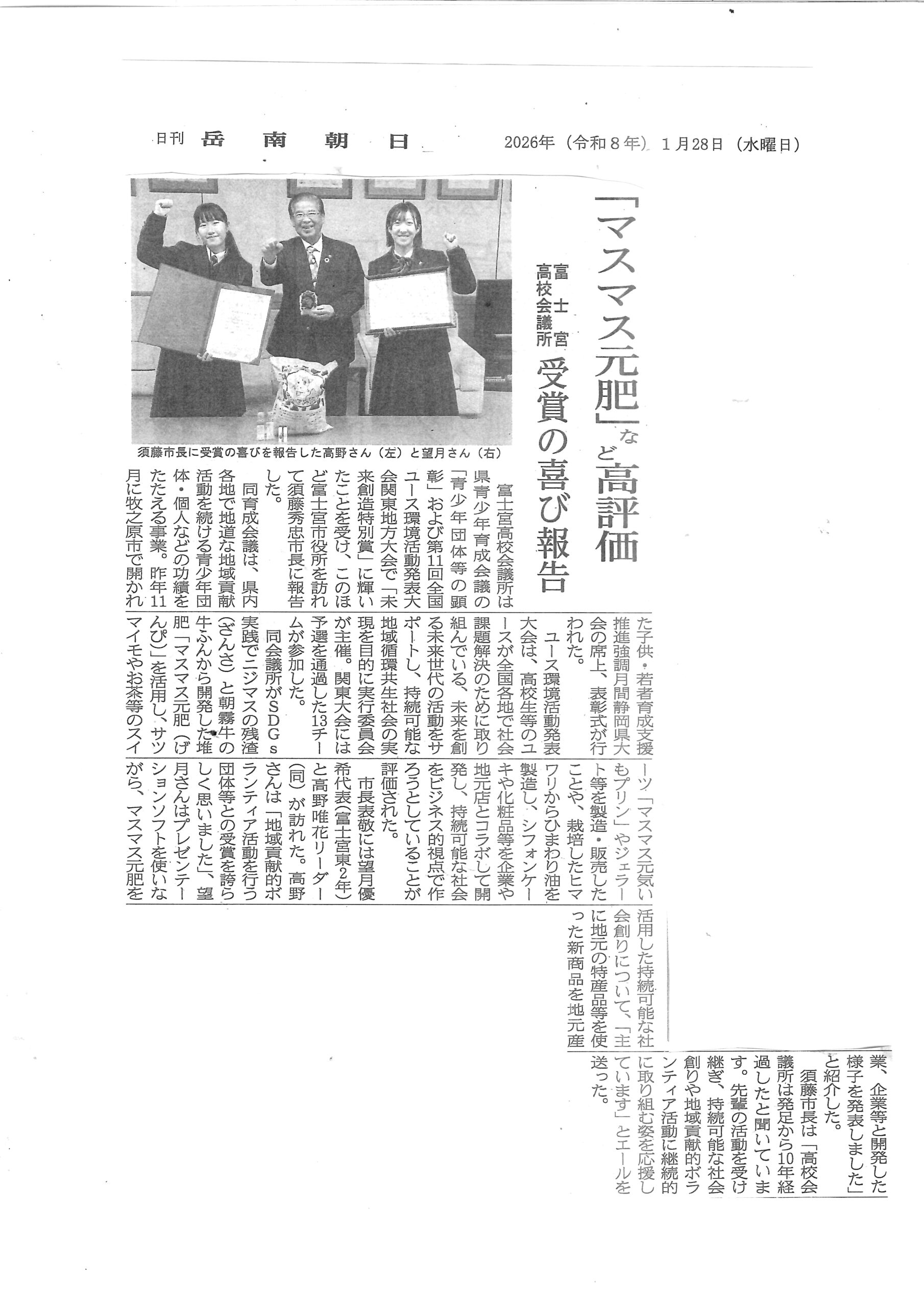 富士宮高校会議所のメンバーは、11月に、「青少年団体等顕彰」授彰、12月に、予選を経て、12月6日に、全国ユース環境発表大会で、「未来創造特別賞」を授賞を市長に報告した様子が、岳南朝日に掲載されました。