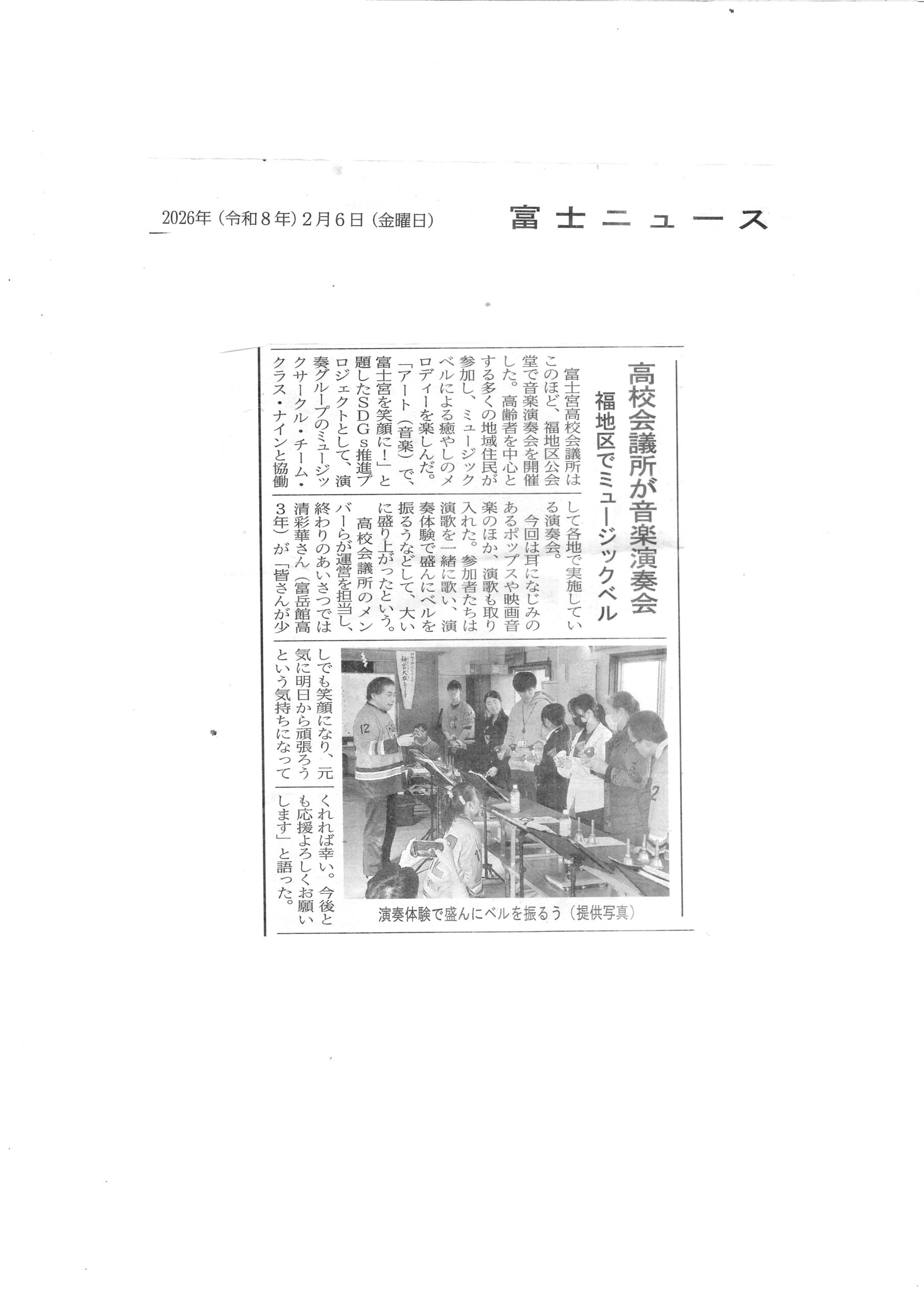 ミュージックサークル ハンドベル演奏会を福地区寄合処にて開催した様子が、富士ニュースに掲載されました。