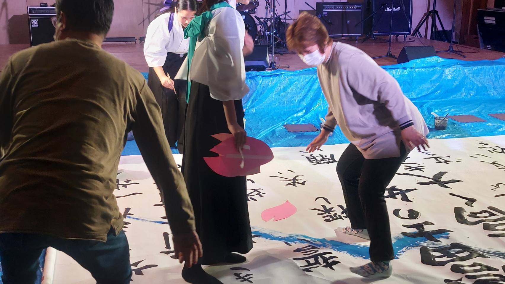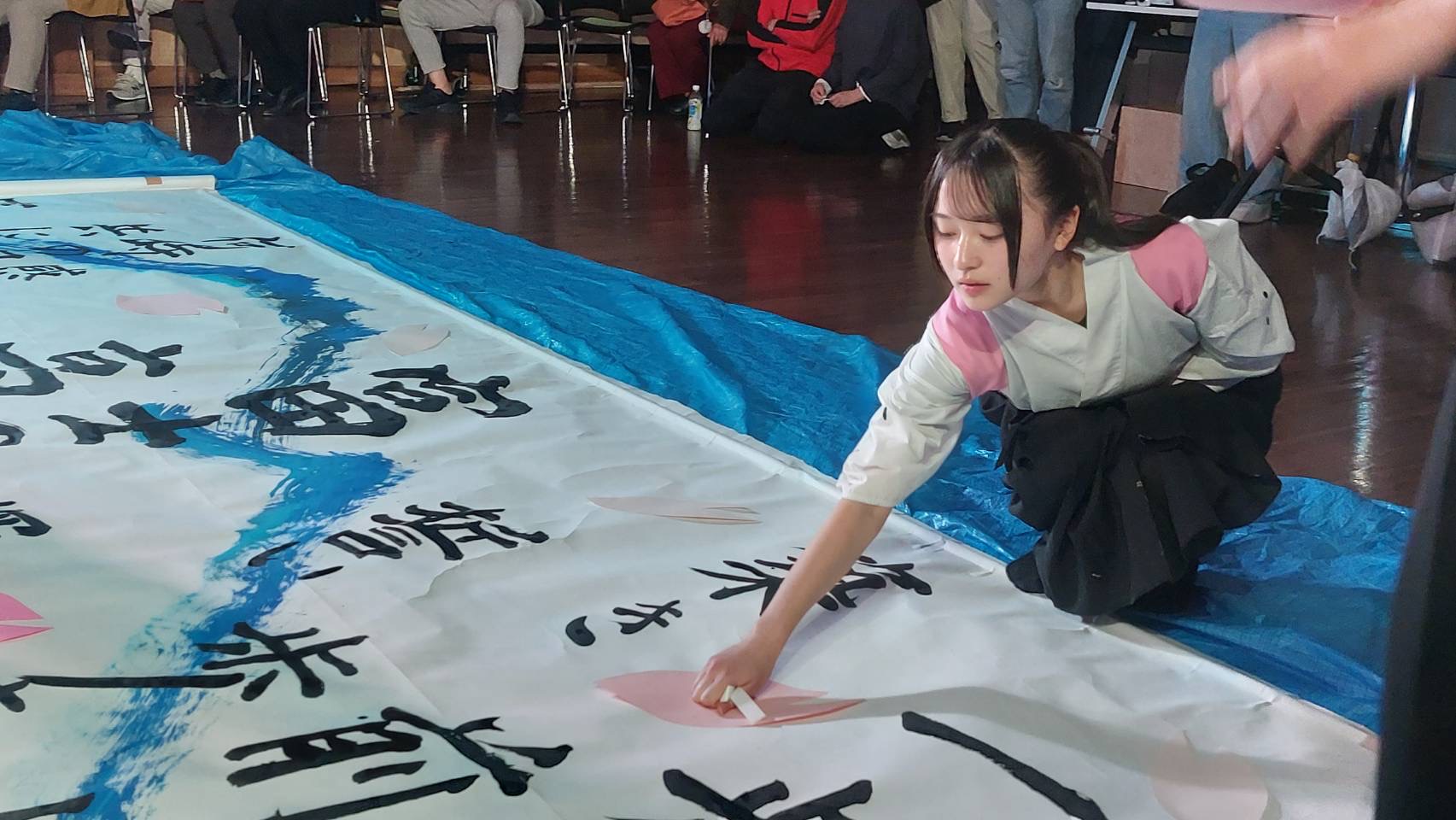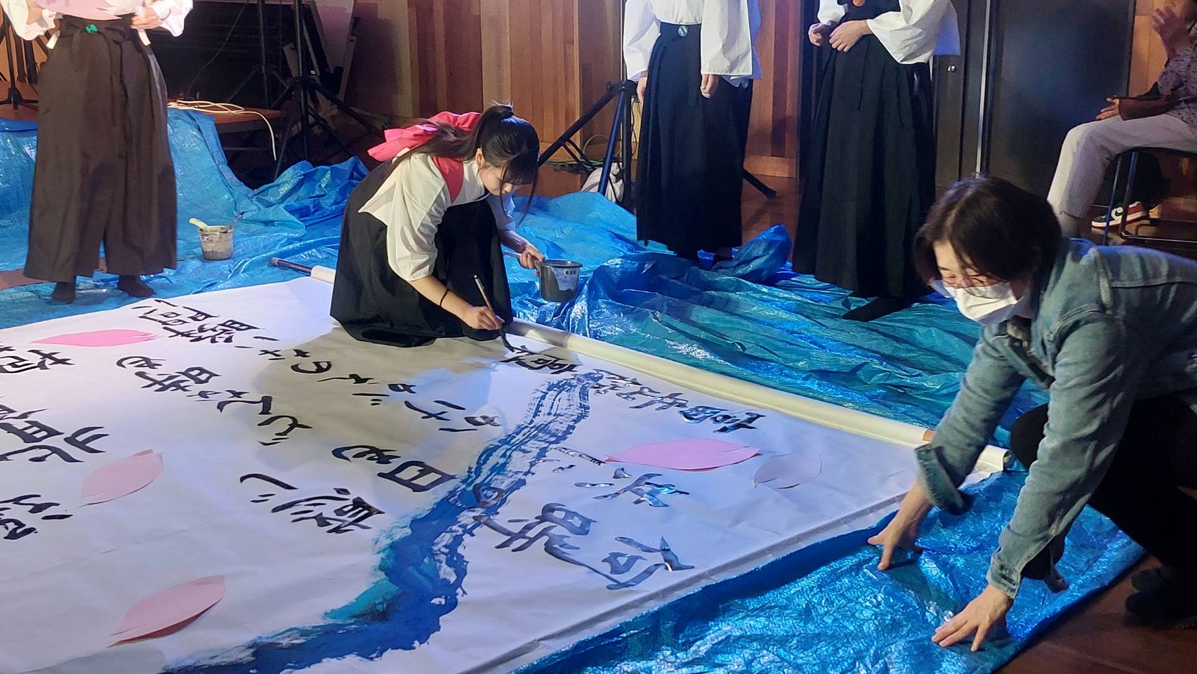 書道パフォーマンス作品の周りに集まってください。