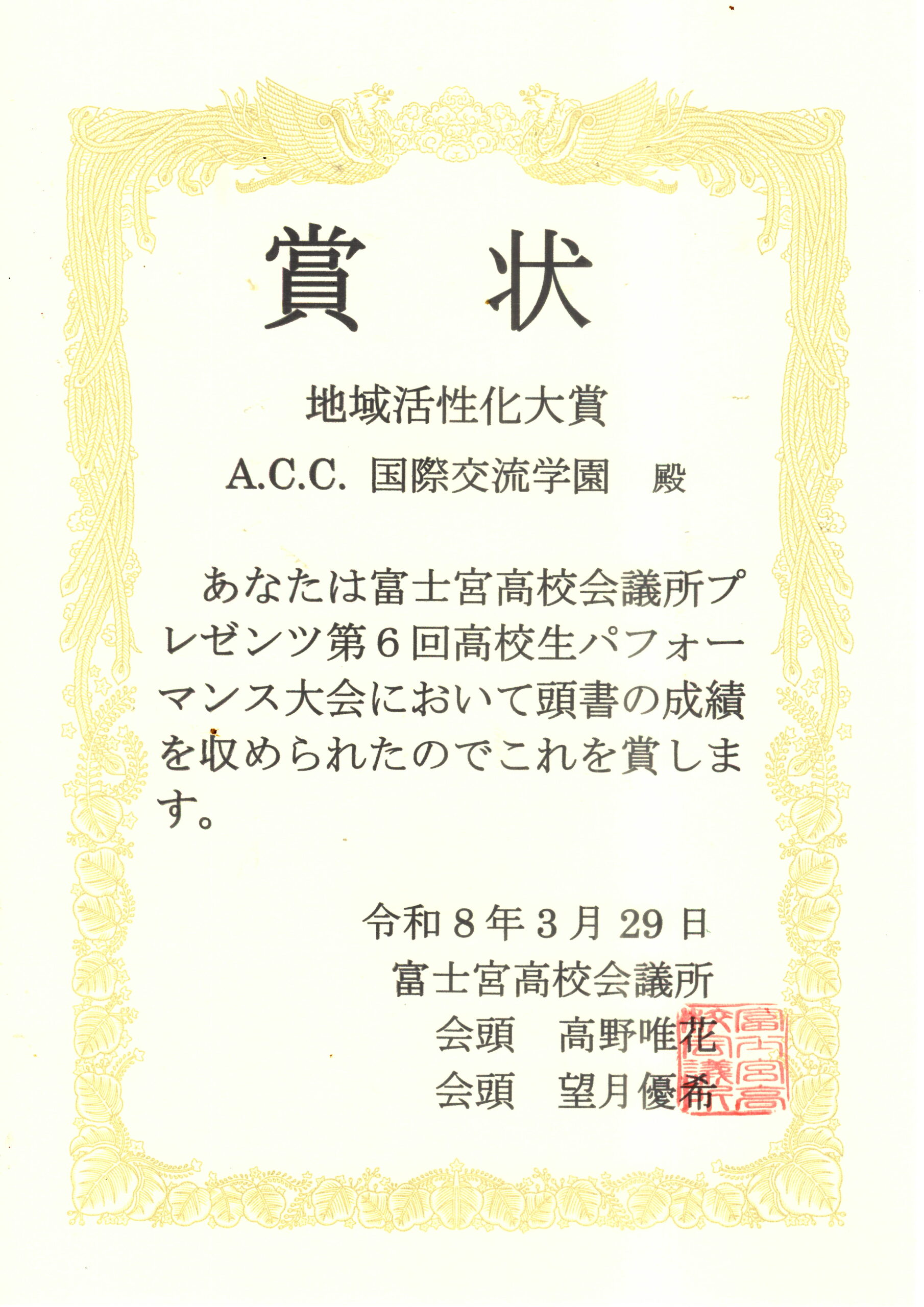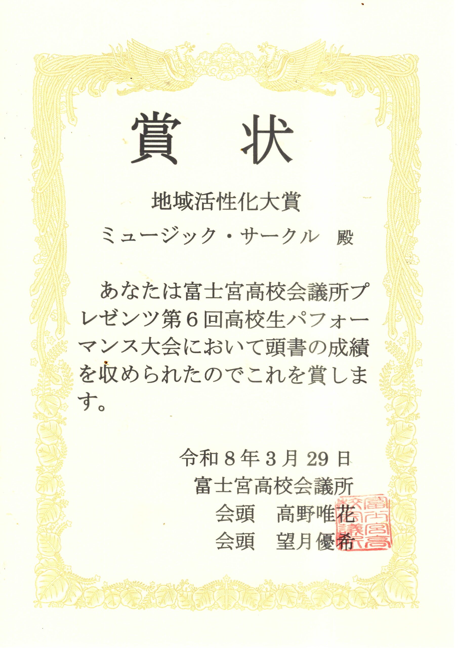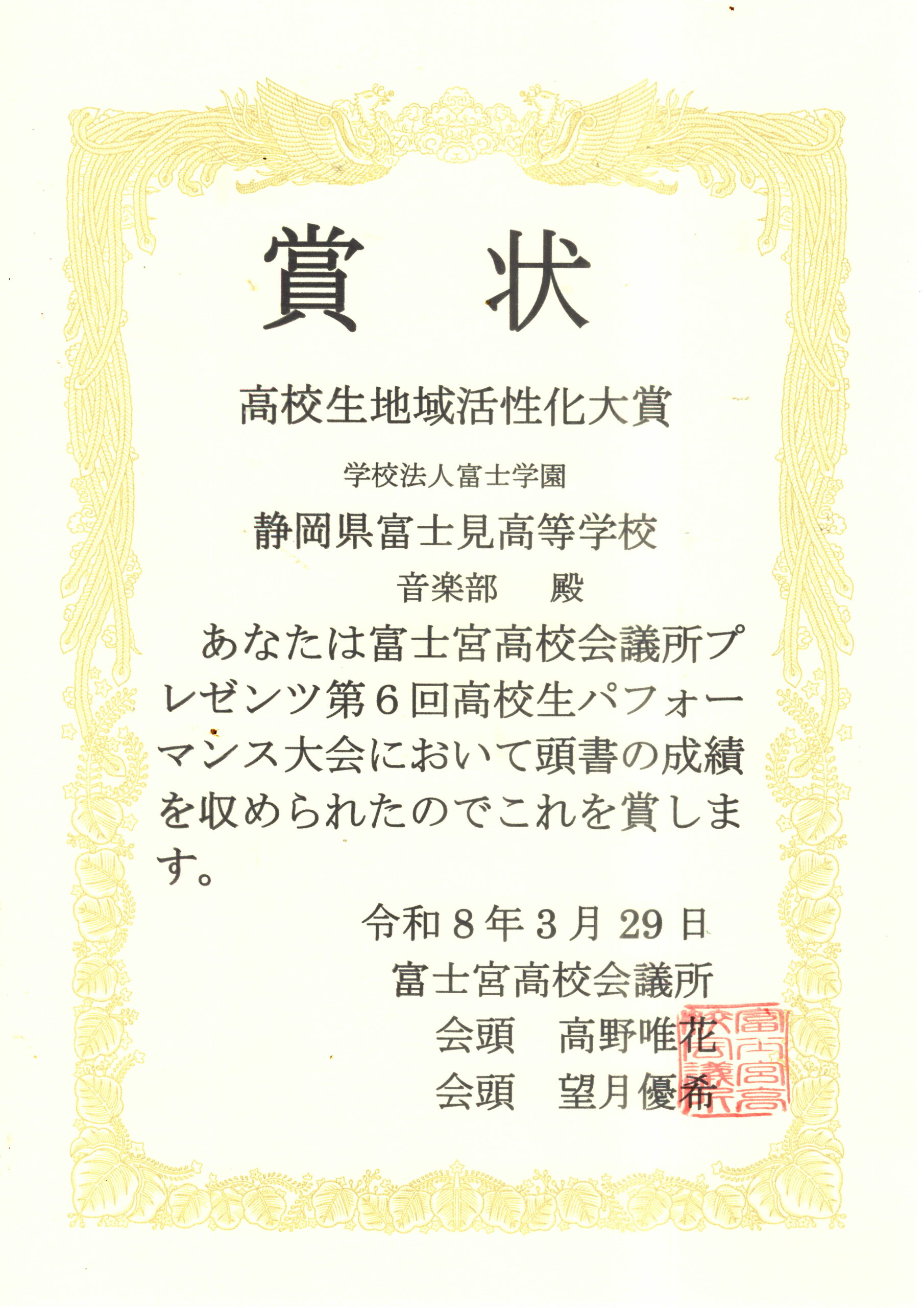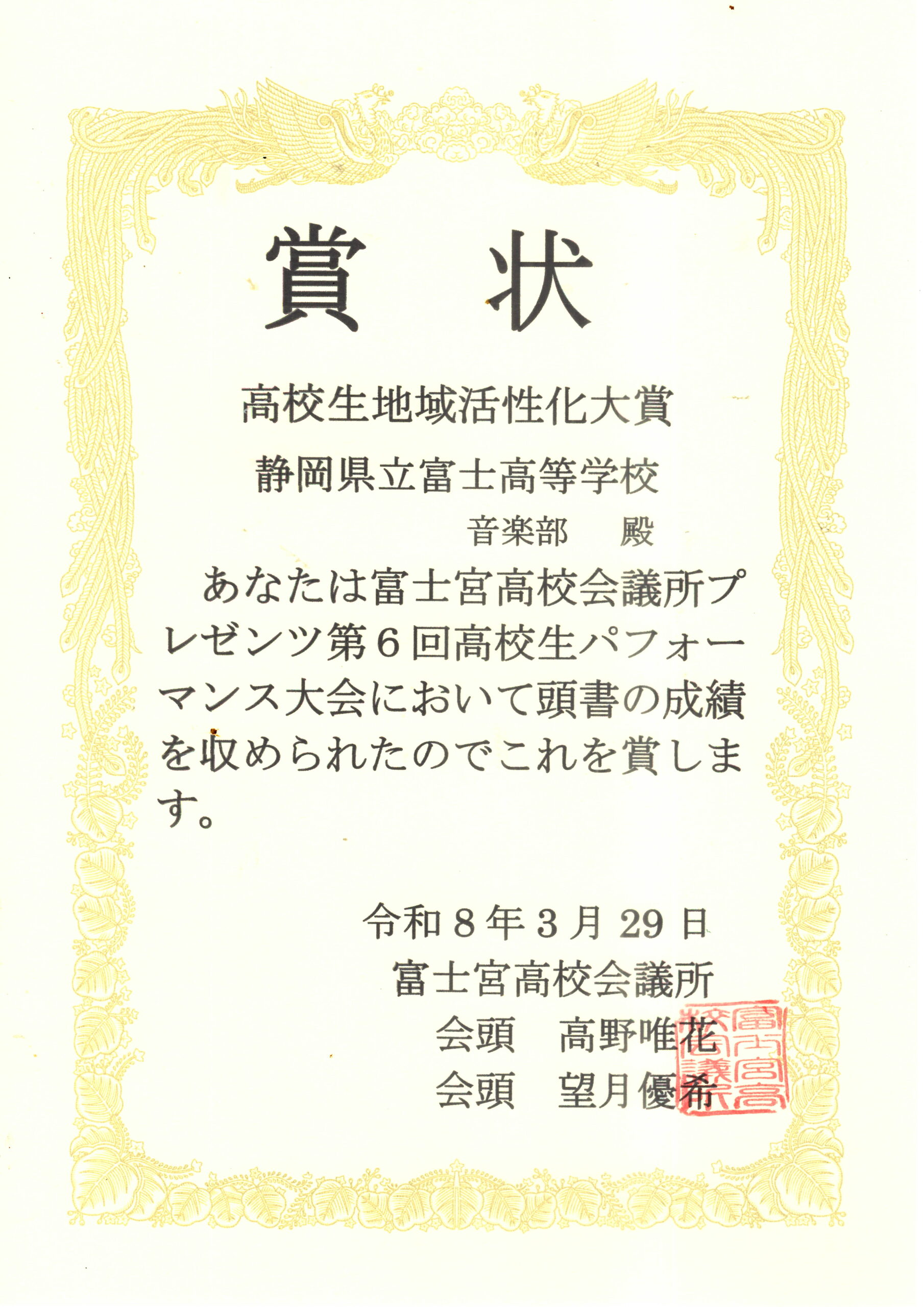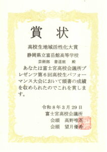 それでは、演奏に対して、富士宮高校会議所から「高校生地域活性化大賞」の表彰状を授与したいと思います。