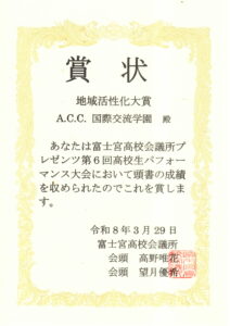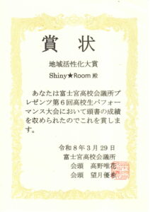 それでは、今のダンスパフォーマンスに対して、富士宮高校会議所から「地域活性化大賞」の表彰状を授与したいと思います。