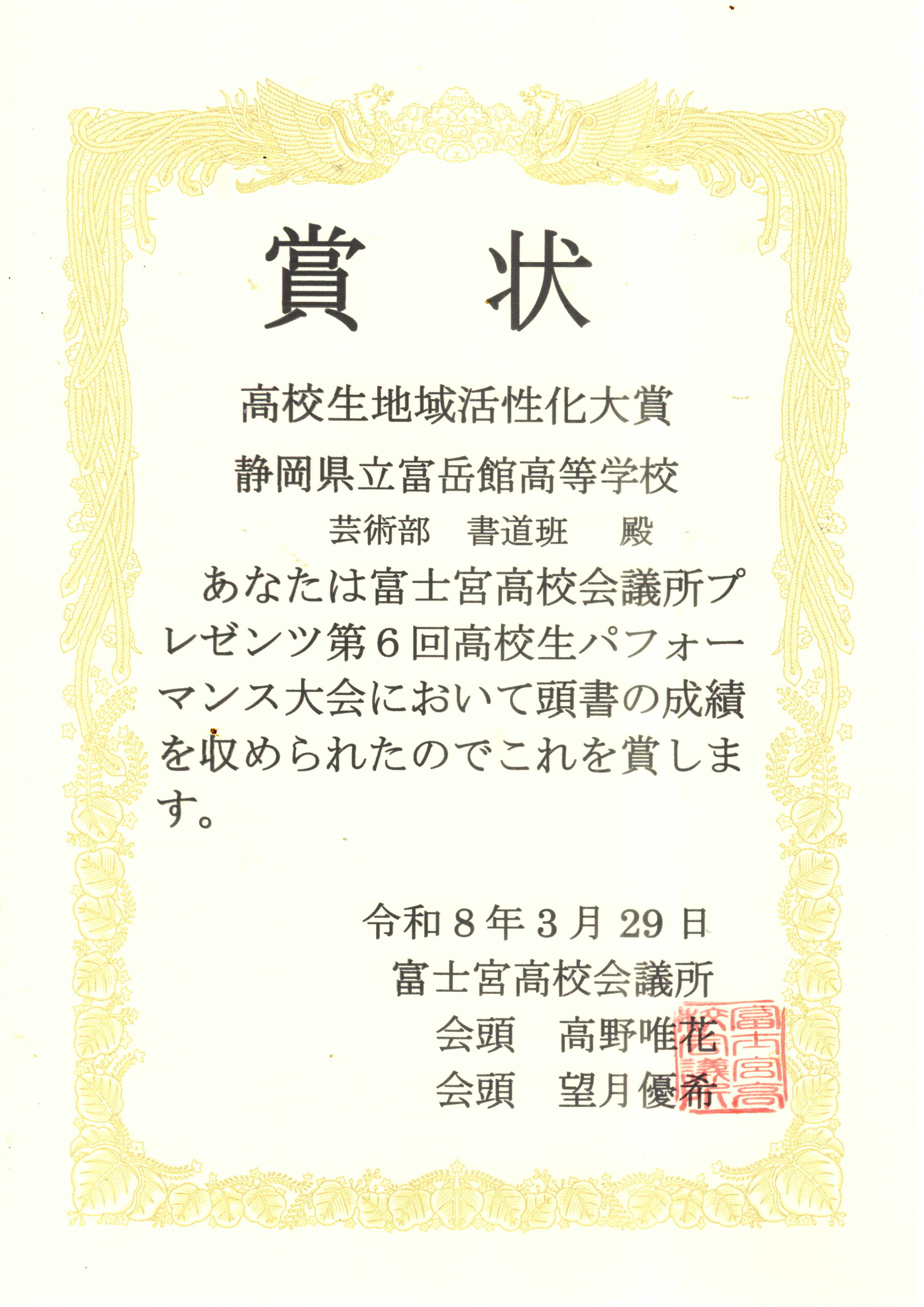 それでは、書道パフォーマンスに対して、富士宮高校会議所から「高校生地域活性化大賞」の表彰状を授与したいと思います。