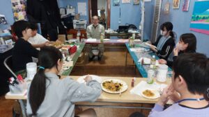 栗田さんからは、にじますの魚醤の開発、商品化について、具体的に説明していただきました。望月さんは、にじますの魚醤を用いての焼きそばを3種類、塩焼きそば、キムチ焼きそば、カレー焼きそばのを作ってくださいました。